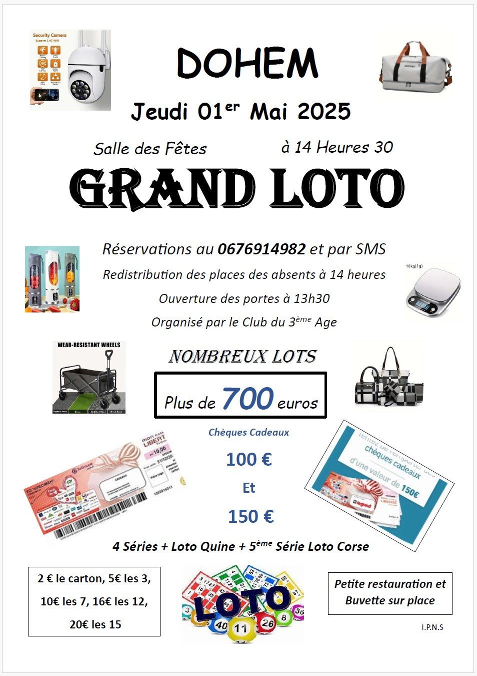 Loto avec de nombreux lots à gagner, ouverture des portes à 13h30